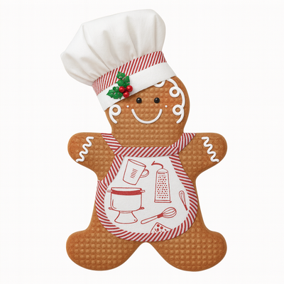 Galleta waffle cocinero, mandil blanco con utensilios de cocina, 22 cm aprox, cordón dorado para colgar. Producto hecho a mano, elaborado en México.