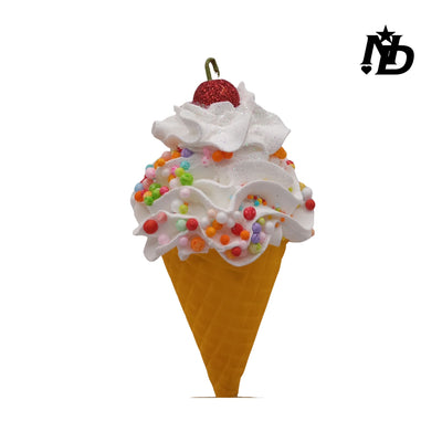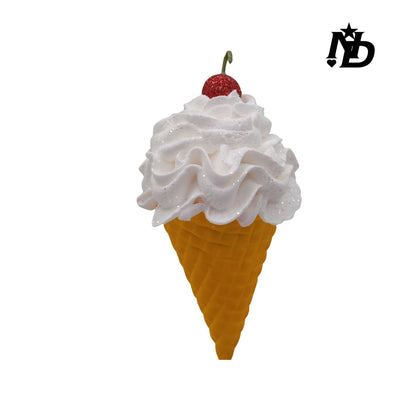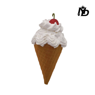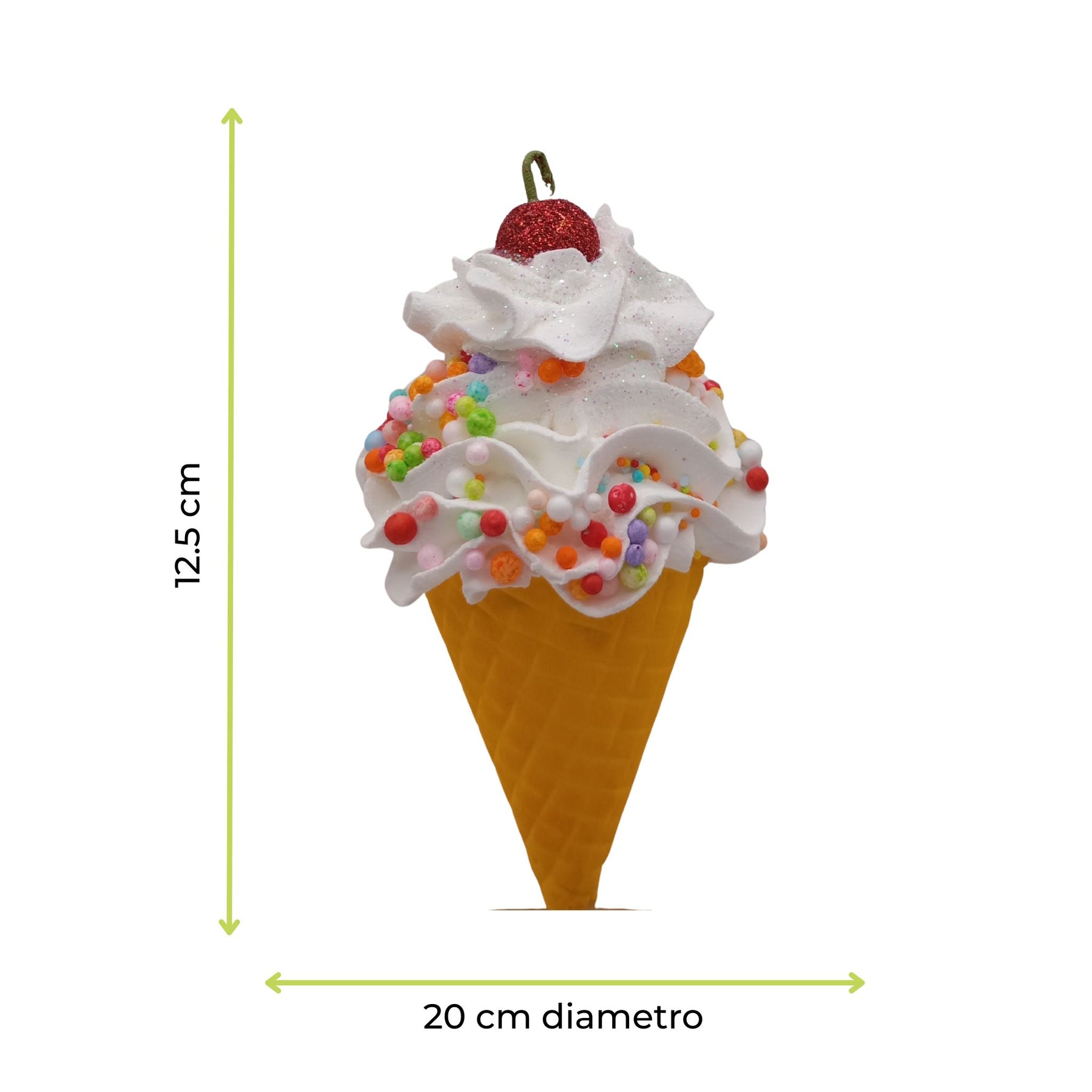 Helado tamaño brocheta, barquillo amarillo, bola crema con cereza, 12.5 cm aprox de altura y un diamatro de 21 cm aprox. Producto ornamental, hecho en México.