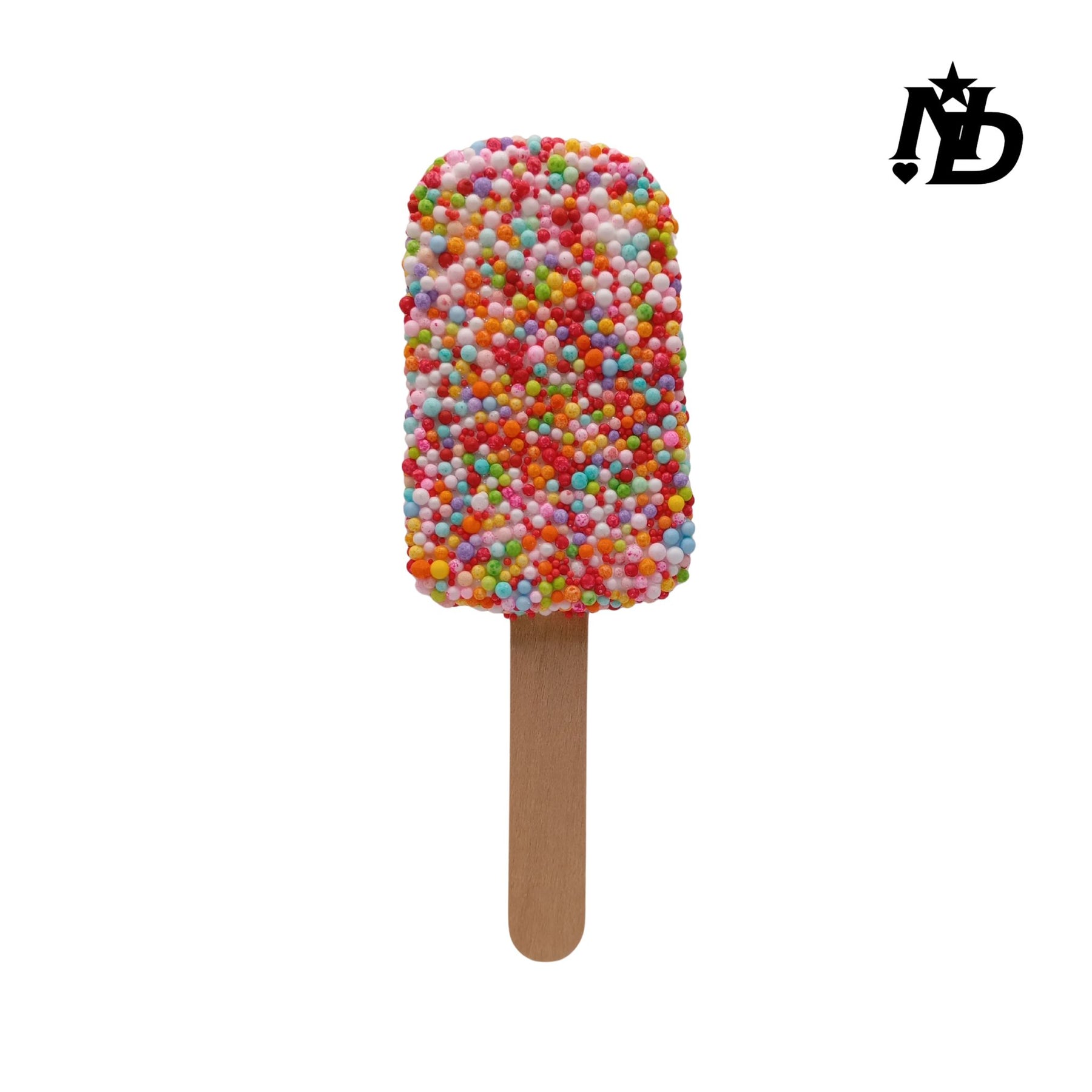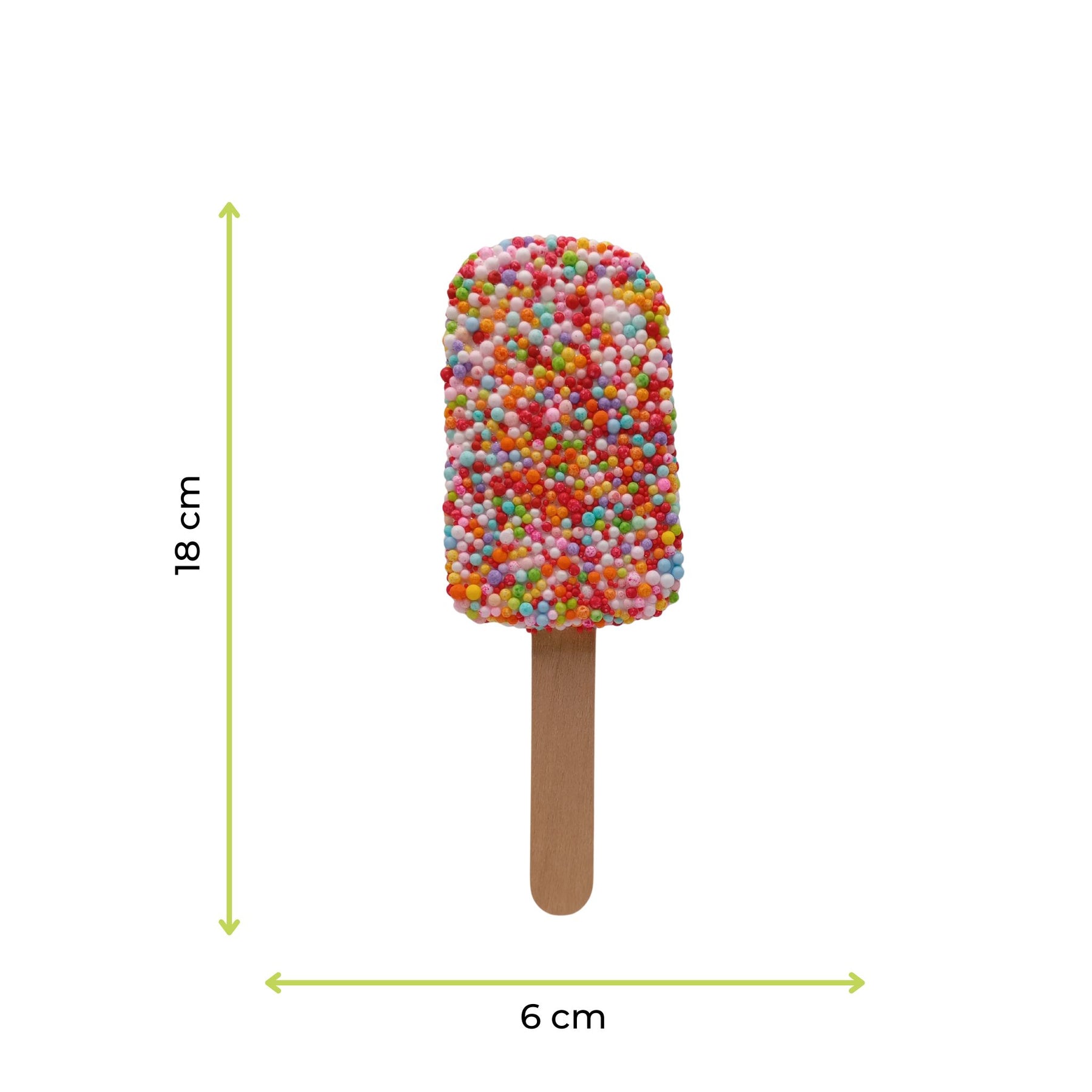 Helado tamaño brocheta, barquillo amarillo, bola crema arcoíris, 12.5 cm aprox de altura y un diamatro de 21 cm aprox. Producto ornamental, hecho en México.
